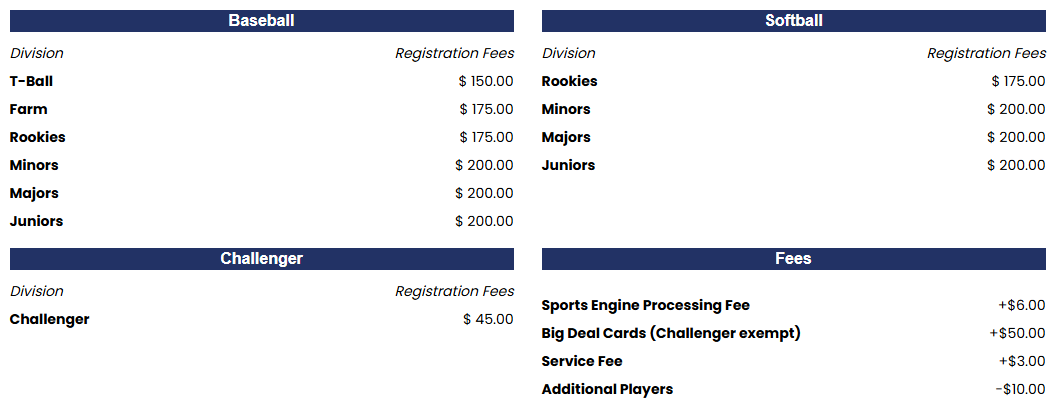 Operational costs differ by division (uniforms, field supplies, equipment, chartering fees, etc.). Registration fees for the 2026 spring season are as follows: